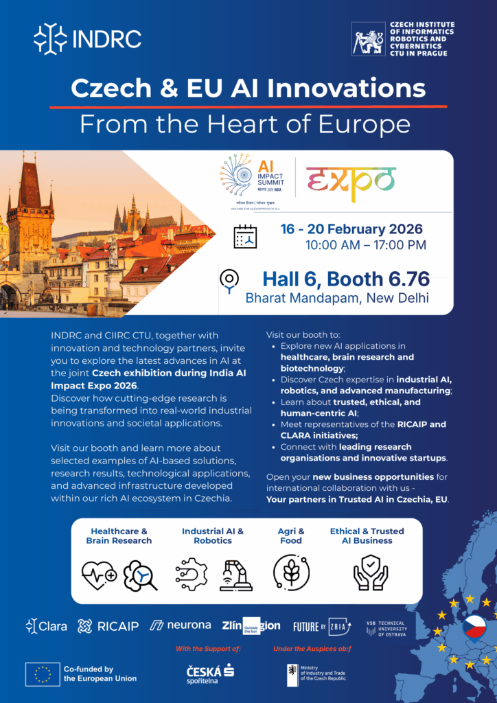 For the first time, New Delhi, India, will become a global meeting point for discussions on artificial intelligence as the India AI Impact Expo and the two‑day India AI Impact Summit 2026 open their doors. Thanks to the cooperation between CIIRC CTU and INDRC, RICAIP will be featured in a compact yet content‑rich Czech exhibition selected in strong international competition. RICAIP will present its activities and industry collaboration in a dedicated session on Harnessing AI for Health Equity on February 16, organised by NIMS University and Marik Institute of Computing, Artificial Intelligence, Robotics and Cybernetics. It will also contribute to the workshop Navigating the AI Regulatory Landscape – A Cross‑Compliance Framework for Safety & Governance, and furthermore will be showcased at the INDRC booth at the India AI Impact Expo.