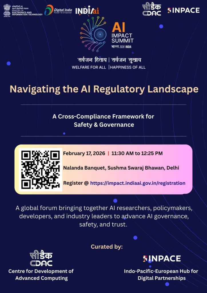 The workshop “Navigating the AI Regulatory Landscape – A Cross‑Compliance Framework for Safety & Governance” will bring together experts from government, academia, and industry to explore global models of AI regulation and safety. Focusing on governance mechanisms in India and Europe, the session will address risks posed by autonomous agents and synthetic content, and highlight practical approaches to building secure and trustworthy AI systems. Aimed at policymakers, researchers, and technology leaders, it will offer concise guidance for shaping responsible, scalable AI ecosystems.