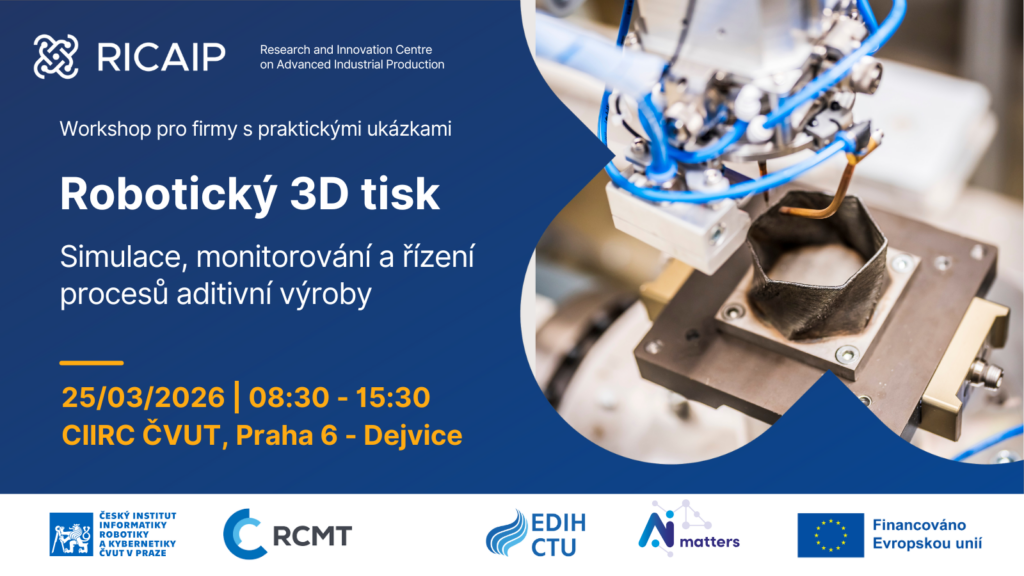 | 09:05-09:15 | Průmyslové roboty a aditivní technologie: silné a efektivní řešení pro výrobu Petr Kolář, RCMT FS ČVUT, IPA CIIRC ČVUT |
